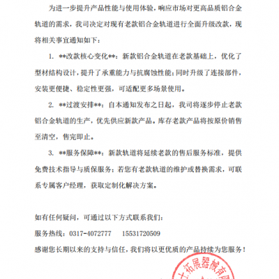 November 27, 2025**Notification of Upgrade and Redesign for Aluminum Alloy Tracks** Dear Clients and Partners, In order to fu